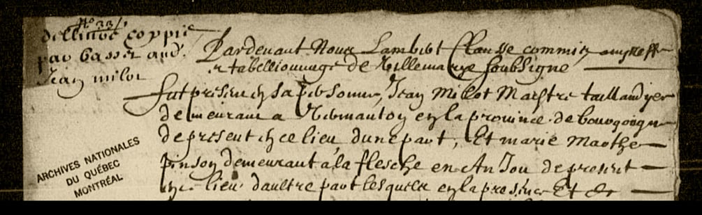 RÉSUMÉ: Contrat de mariage entre Jean Milot et Marie Marthe Pinson