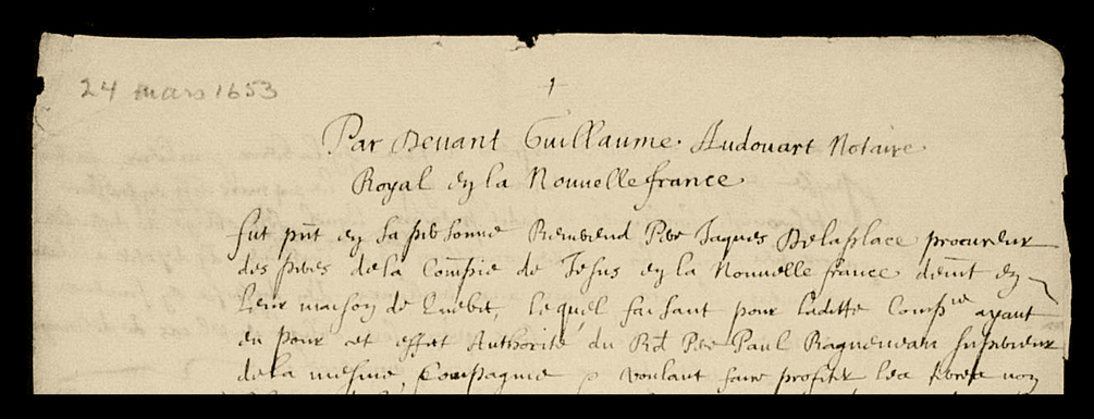 RÉSUMÉ: Concession d'une terre de 3 arpents de front par 20 arpents de profondeur à la seigneurie de Notre-Dame-des-Anges par les Jésuites à Robert Drouin